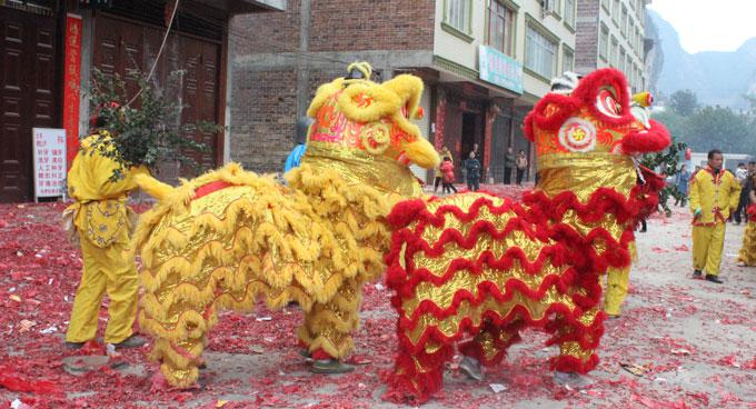 ある地域では、新年の日、獅子舞は人家をめぐって挨拶する習慣もあります。その時、家では幸運を祈るため礼物を用意します。竿の先に掛けられた礼物を、獅子舞の踊り子たちは競ってそれを取り合います。