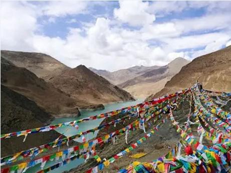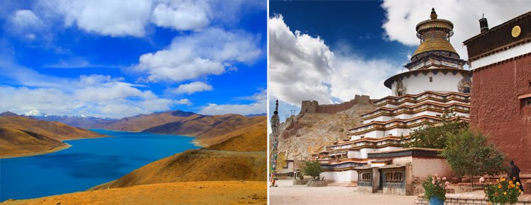ラサからギャンツェに車で向かいます。途中、ガンバラ(標高4790m)を通り、またヤムドク湖(標高4400m)を車窓からちらりと見ることができます。ヤムドク湖は周りを雪山に囲まれています。そのまま車はギャンツェを通りさらに西へ進みます。