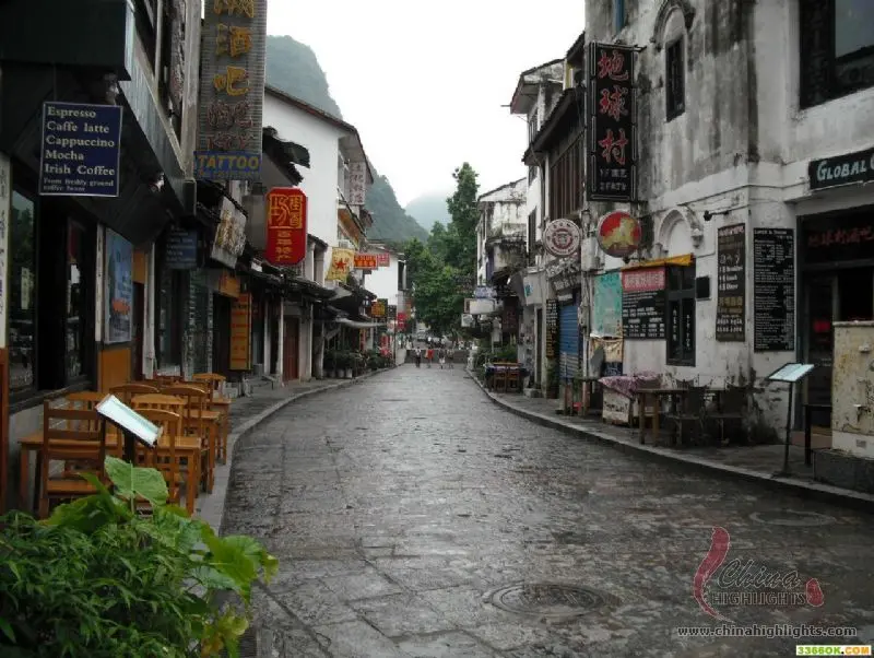 西街は中国と外国文化の交わったような町なのです。外国人はここに東方文化を体験し、中国人はここで外国語を練習します。西街の家は中国の南部地方の建物ですが、国際的な雰囲気を持っているので、人と文化の景観と言っても過言ではありません。古めかしく優雅な店舗の中で、装飾が異国情緒に溢れています。ネットカフェー、バー、レストラン、旅館などは全ての看板が英語と中国語で書かれています。また、店員は 英語が上手です。店長が外国人の店も少しあるので、そのため、西街は「地球村」とも呼ばれます。