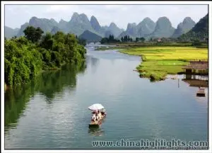 桂林山水は“大家闺秀”(名門の令嬢),遇龙河は“小家碧玉(庶民の家の美しい娘と言われます。ここでは、更に静かで心地良いです。漓江と江宽山の山並を人は称賛し、ここの川の両岸は、農村の木陰が幾分心地よいです。)遇龍河漂流の全コースは12キロで、渇水期では5~6時間がかかり、渇水期でなければ、3~4時間だけでいいです。